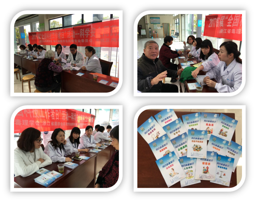 2017年4月14日,由楼宜嘉教授和韩峰教授带队,浙江省毒理学会和浙江省药学会药理专业委员会联合余杭区鸬鸟镇社区医院,共同组织浙江大学药学院药学专家、浙江大学附属第一医院和浙江省人民医院的临床药师十余人前往鸬鸟镇开展了科学安全用药咨询活动。向村民们普及健康保健及药品安全相关知识,尤其是老年人高血压、糖尿病、骨质疏松等用药原则,消除用药认识和行为上的误区,指导村民如何正确从看包装、读说明、辨文号、识期限等方面购选放心药,发放安全用药科普宣传资料,促进公众建立科学的药品消费理念、安全观念和健康生活习惯。作为浙江省首批响应2017首届“全国科技工作日”的主要活动,专家们的咨询活动受到了当地村民的一致好评。
